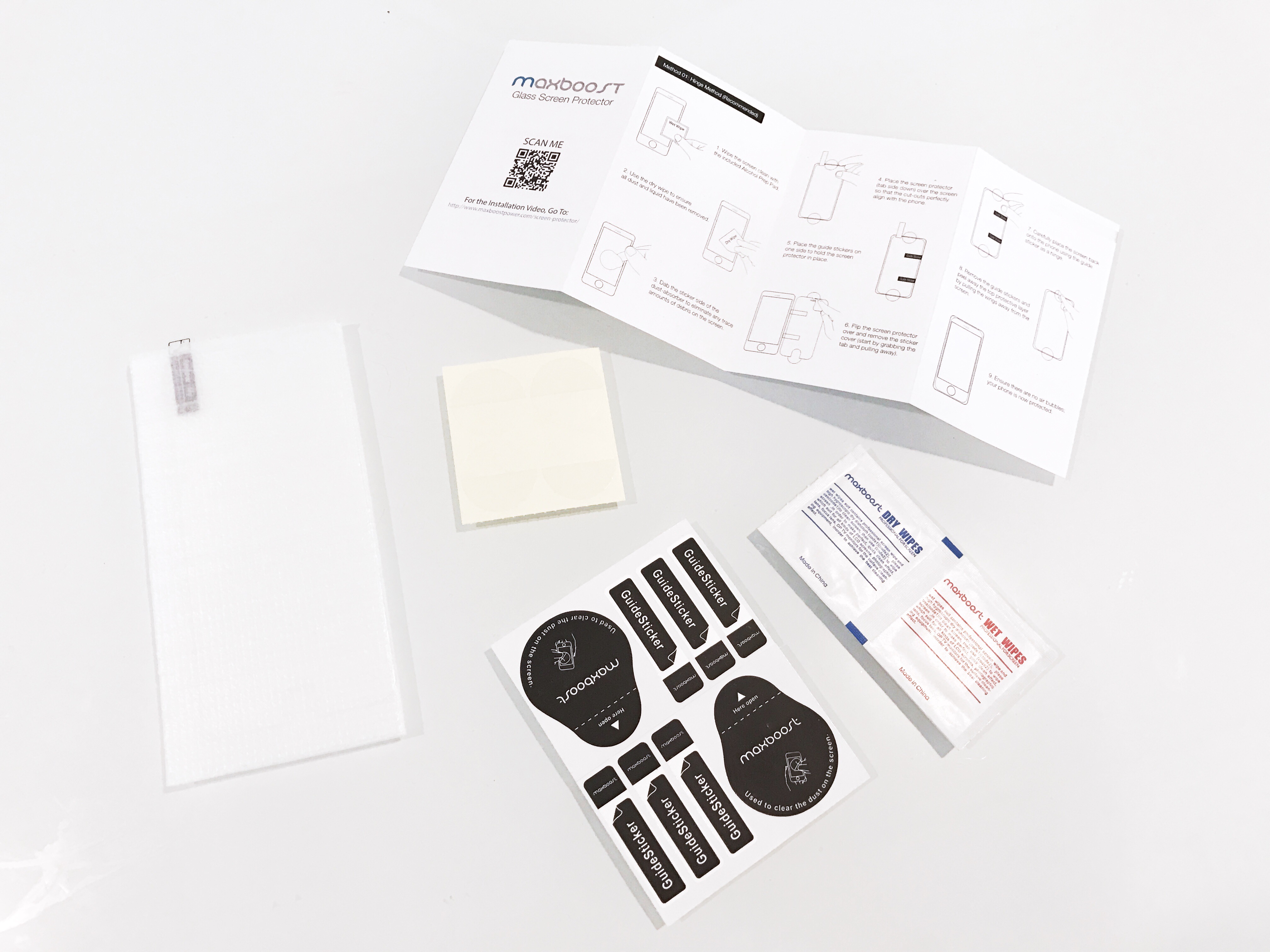 Upon opening, it was mostly standard stuff… Wet wipe, dry wipe, instructions, etc. The only difference was that this 2-pack also included a “hinge” option, allowing you to “perfectly” affix the glass screen protector by pivoting it on the provided sticker hinges (like a door). I decided to apply it the old fashioned way: by eyeballing it.
