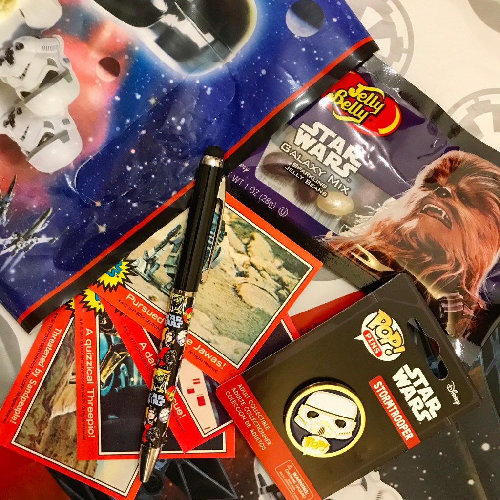 Yes, actual vintage 1977 Topps trading cards, a Funko Pop Stormtrooper pin, a pen/stylus, and some Jelly Belly sparkling Chewbacca jelly beans!