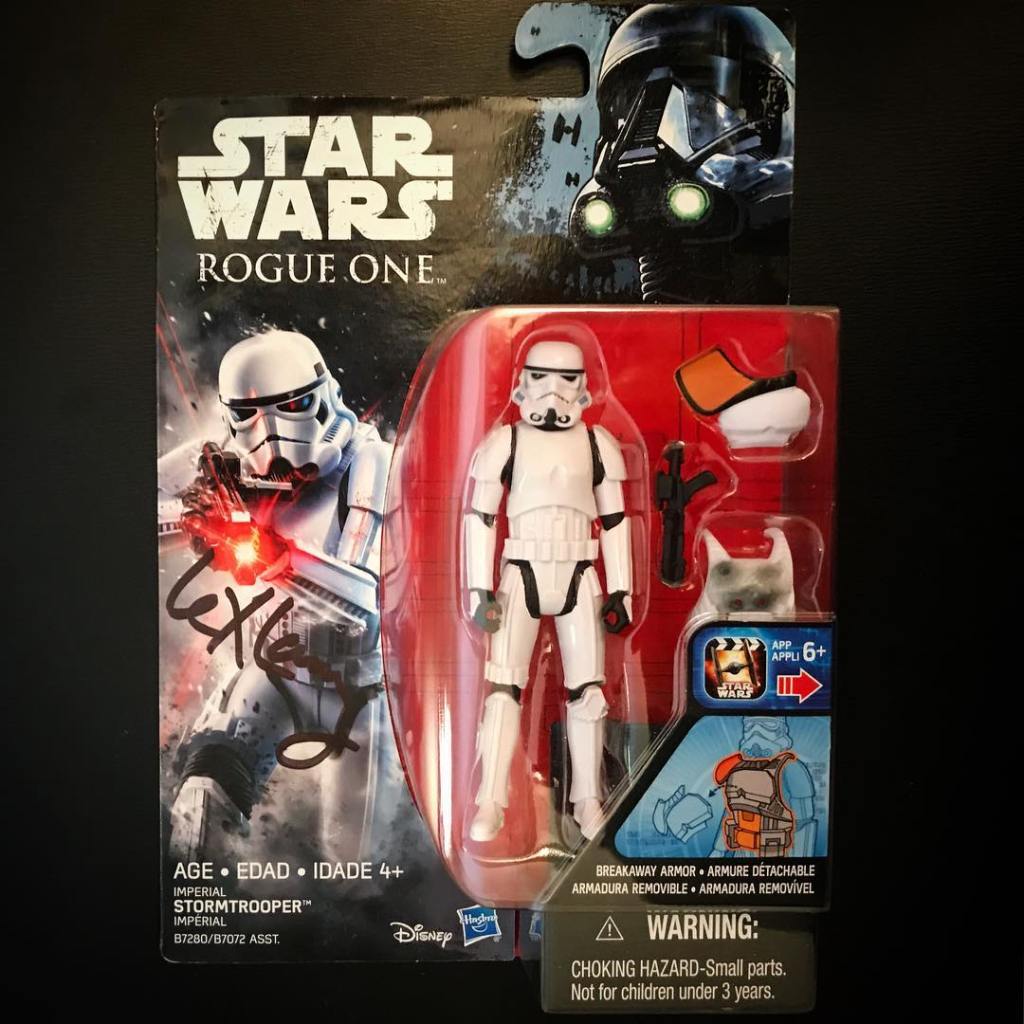 He signed my Rogue One Stormtrooper figure! We got a photo together and as he signed my Stormtrooper trading card, I asked him if he’d seen the new Rogue One trading cards by Topps. He said he hadn’t, so I gave him one of the extra ones I brought of troopers storming the beach of Scarif. He seemed to really appreciate it