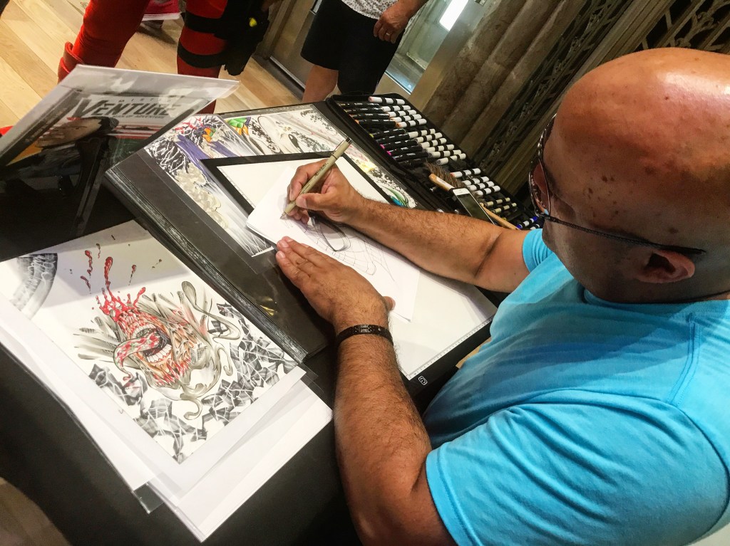 As we were leaving, we made sure to stop by Will Torres’ booth for a free sketch! Will is a great artist who was sketching Spider-Man profiles all day but decided to switch things up for me by sketching a Frank Miller-esque Batman! (You can watch the time-lapse at the end of this post.) But while he was sketching, we got to chat about his work including his original comic book co-created with Stan Lee titled, Mister Adventure, Man of Adventure.