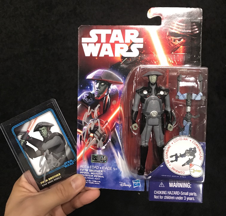 On Saturday, I met Philip Anthony-Rodriguez (the voice of the Fifth Brother in Star Wars Rebels) who signed an 8×10, my Fifth Brother figure, and my Topps card.