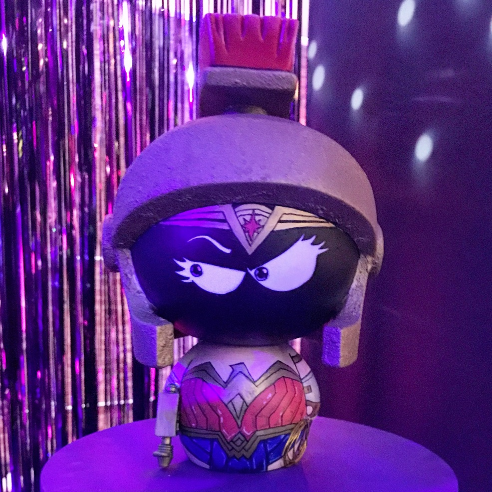 As you feast your eyes on all the great wall decals and neon lights, you’ll also find some fantastic art pieces. The next room featured a collection of Marvin the Martian figures painted to resemble popular superheroes. Each was painted by a different artist. Here’s a “Wonder Woman” Marvin the Martian by Tony B. Kim: