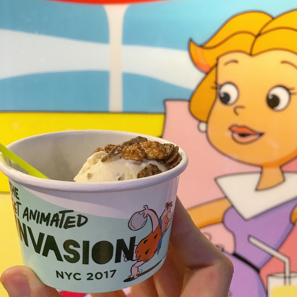 As soon as you enter, you’re given a voucher which entitles you to one of three Flintstones themed ice cream treats brought to you by Milk & Cream Cereal Bar. Choose from: Dizzy Dino (Fruity Pebbles blended ice cream topped with Fruity Pebbles & Dino Bones Candy), Bamm-Bamm Thank You Ma’am (Cocoa Pebbles blended ice cream topped with Cocoa Pebbles & Salted Caramel Rock Candy), or The Bedrock-y Road (Cinnamon Pebbles blended ice cream topped with Cinnamon Pebbles, Marshmallows & Chocolate Rock Candy).