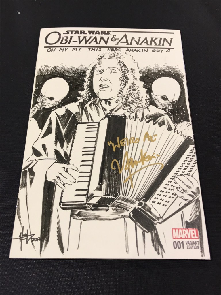 If you’re just tuning in, I got this Obi-Wan & Anakin #1 comic sketched by Creees a few months ago at Garden State Comic Fest. Hoping to meet Weird Al at RICC, I asked Creees to draw Al in his Saga Begins attire (a la live performance) along with the first line of the chorus. It was perfect! Be sure to check out more of Creees’ art if you’re interested in prints or commissions!