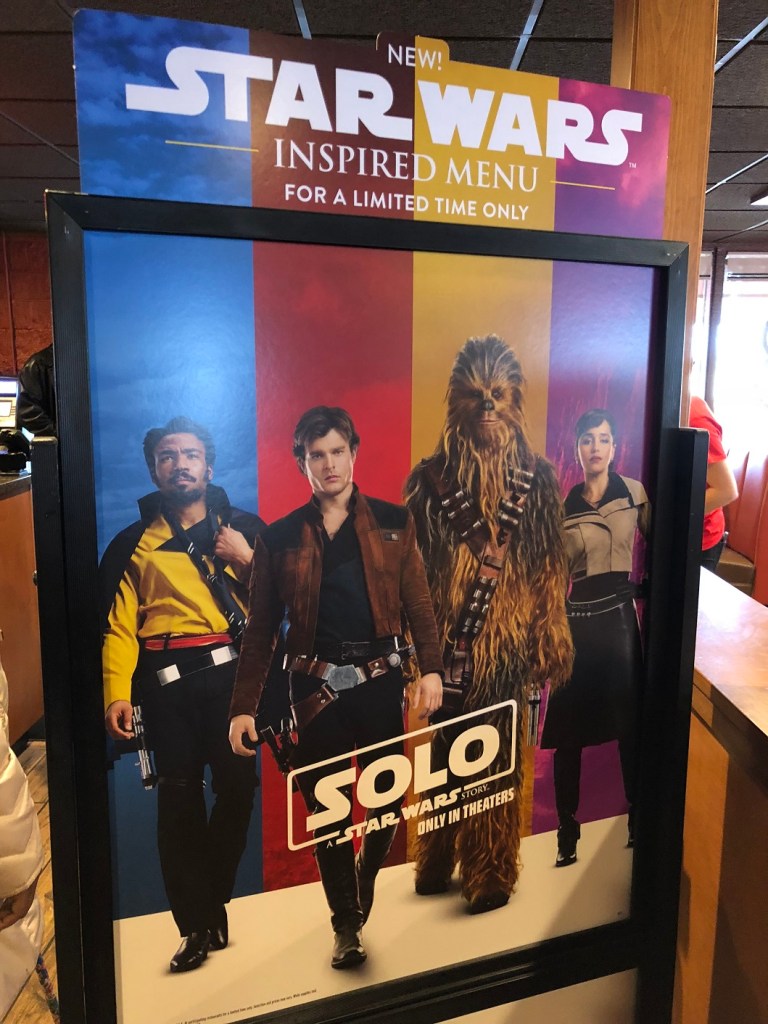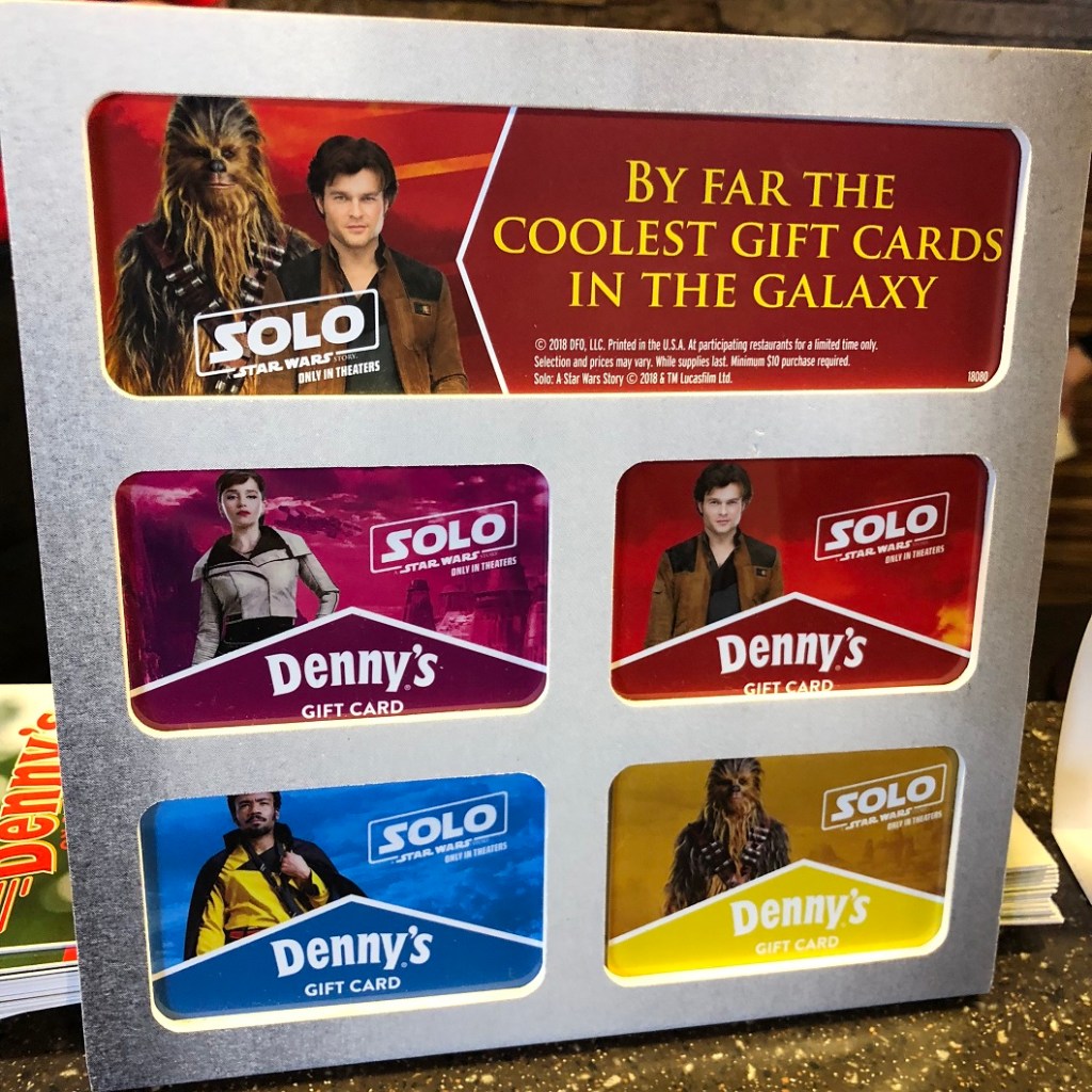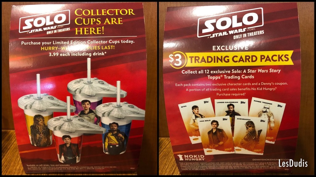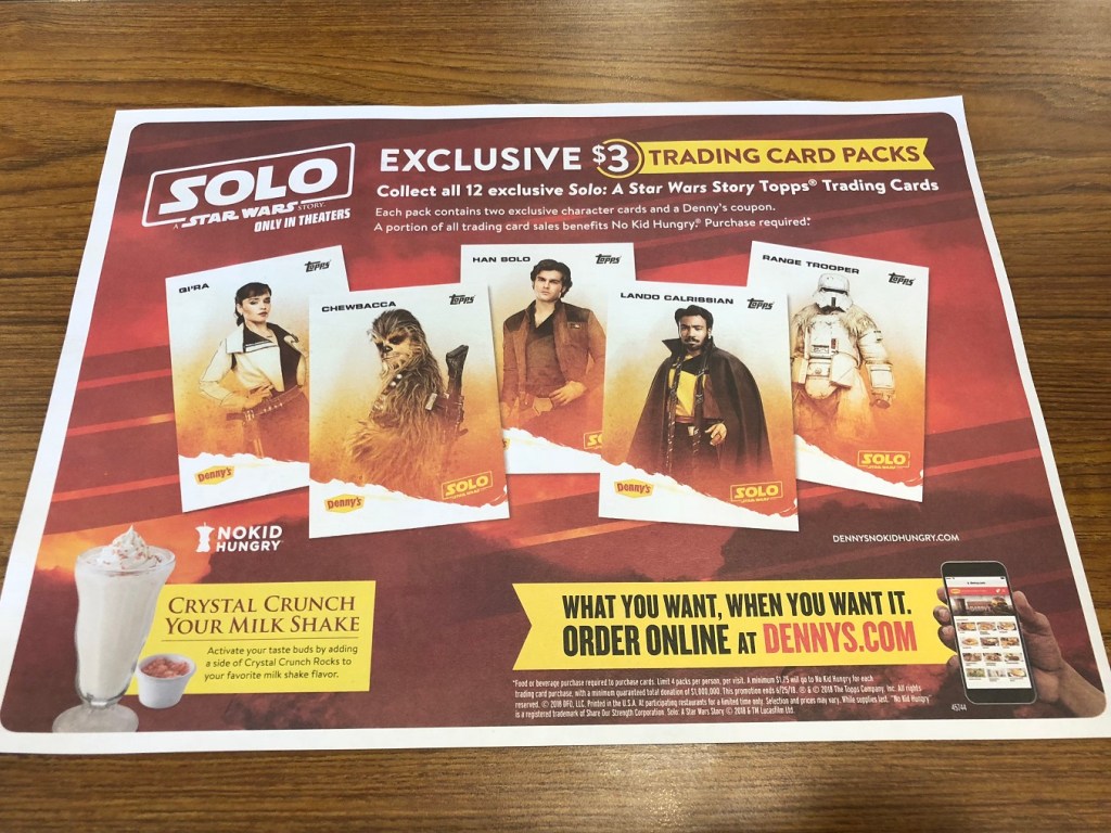 Everything inside Denny’s was Solo-fied. Signage, menus, placemats, and even employees donning red Solo themed t-shirts while offering Solo branded gift cards: