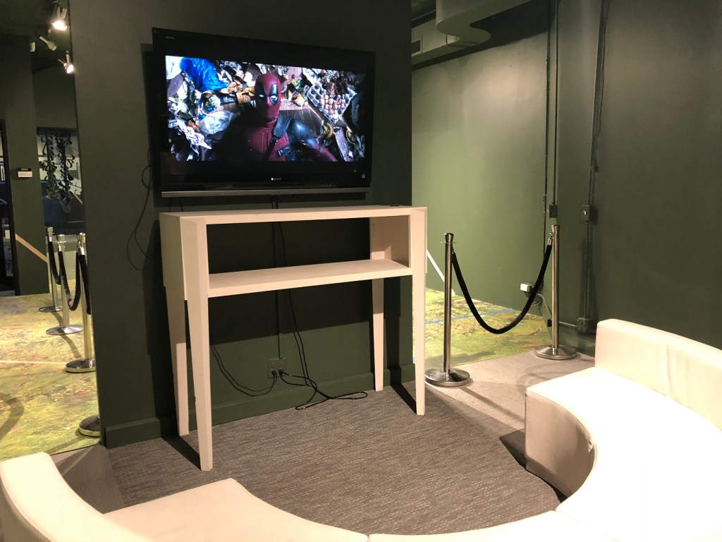 Right in the middle of a flash thunderstorm, I made it to the pop-up with just a little time to spare. Ryan Reynolds’ 2016 film was playing on a flat screen where fans could wait or get their items ready for signing.