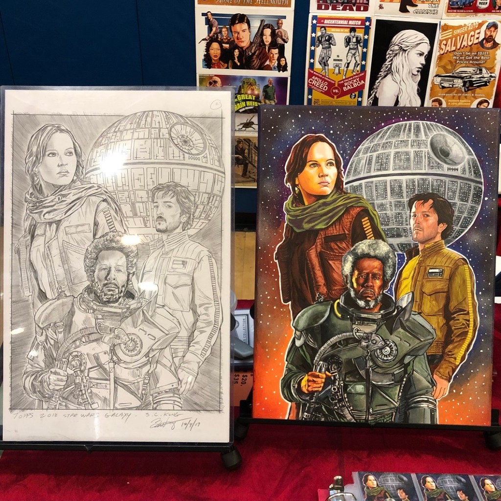 Specifically, he had the original pencil sketch and acrylics done for base card #26 from the Star Wars Galaxy 2019 set and was even offering this particular card signed at his booth: