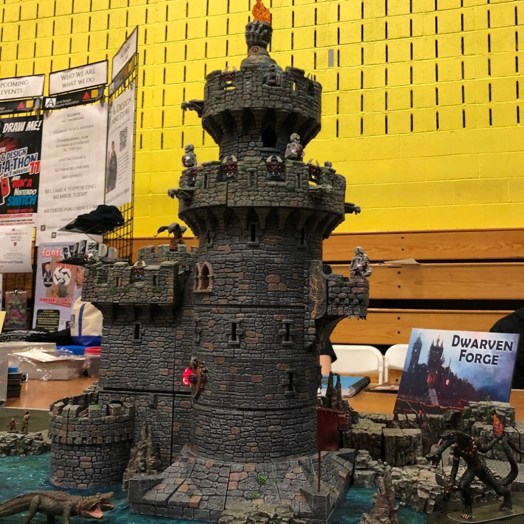 Dwarven Forge displayed a beautiful castle setup comprised of multiple hand-painted pieces, intended for tabletop gaming or for miniature terrain purposes. They can come painted or hand-painted: