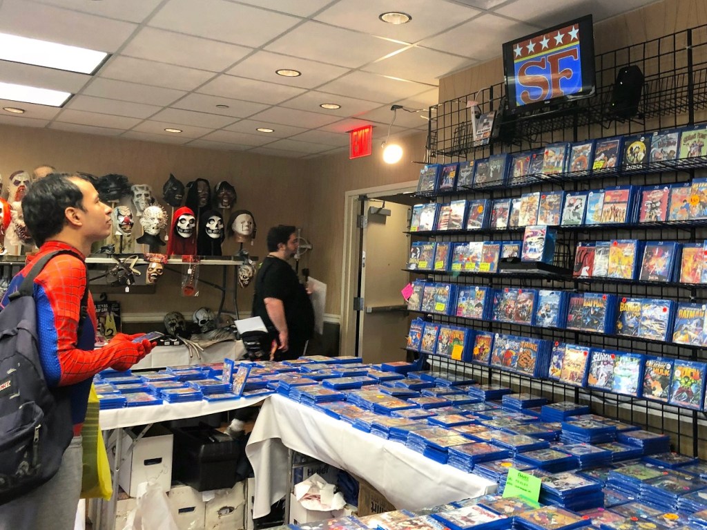 But if toys aren’t your thing, not to worry! There was a fine selection of video games, sci-fi & horror masks, and TV show collections too. Here’s a Spidey cosplayer watching re-runs of Thundercats & Spider-Man (1967):
