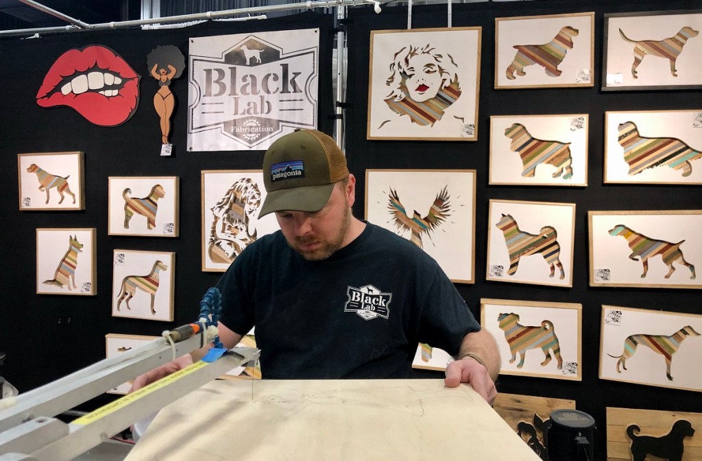 But among the live demos & performances throughout the weekend (including an interactive children’s theater with Carl Odhner), Black Lab Fabrication caught our attention with his hand-cut saw work using reclaimed wood to create beautiful art. Chip personally showed me some pieces and how they were made, followed by an awesome demonstration: