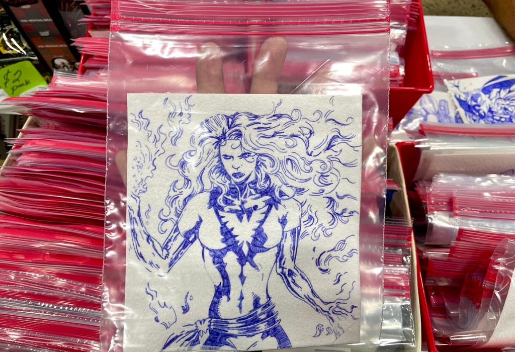 Check out the incredible detail put into this napkin art of X-Men’s Jean Grey (Phoenix) by The Napkin Guy! He and the other artists at the con like Eli Ramos, Yacu Malik, Tim Aichele, and K8-Bit were selling art on all types of mediums: prints, pixel art, etched glass, and even jewelry.