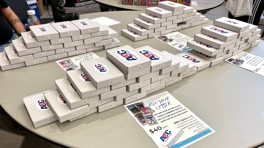 Just some of the vendors at the debut show included: Breakers Club, Sports Connection, NYC Heart of the Cards, DJS Sports Memorabilia, and Kanto Kollectors. Many were buying that day and even accepting trades, so it was common to see collectors walking around with a personal case of their prized possessions to try to trade in (or trade up)! And with a ton of variety available at the show, you could be walking away with sealed wax, booster boxes, hobby boxes, graded cards, or a hefty stack of $0.25 cards! But one way that the Union County Card Show made sure that you could leave with a hit or two was by offering “Pick Your Letter” mystery boxes:
