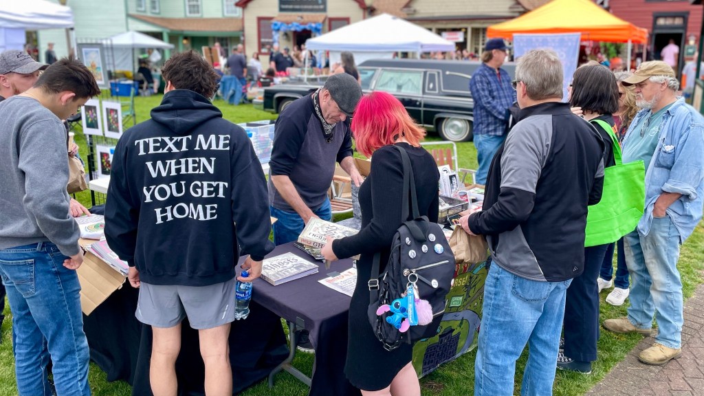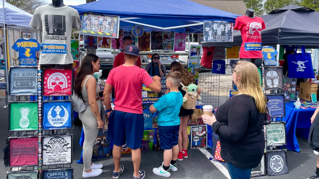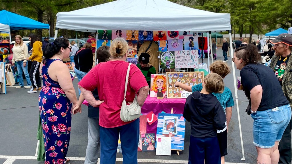 Geek Boy Press (above) was also back with their newly designed Peacemaker t-shirts from the DC Comics show on HBO Max, along with their other geeky apparel, art prints, and custom designed enamel pins! If you’ve never attended a Smithville Art Walk before (here’s a video from 2021), it’s literally overflowing with art of all mediums! We’re talking about woodwork, keychains, etched glass, stickers, assorted paintings, custom coasters, and a newer vendor Saga Stylez with some fun anime inspired art: