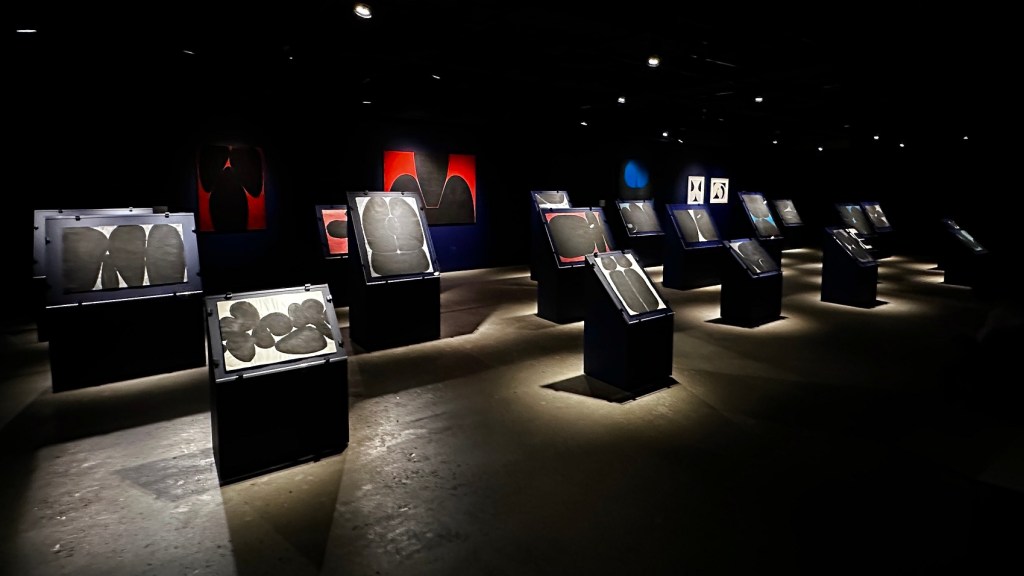 The pieces were provided to the exhibition courtesy of different estates, and are done on a number of mediums such as silkscreen, acrylic on masonite, oil on canvas, and a darkened hall solely devoted to sumi ink on handmade paper: