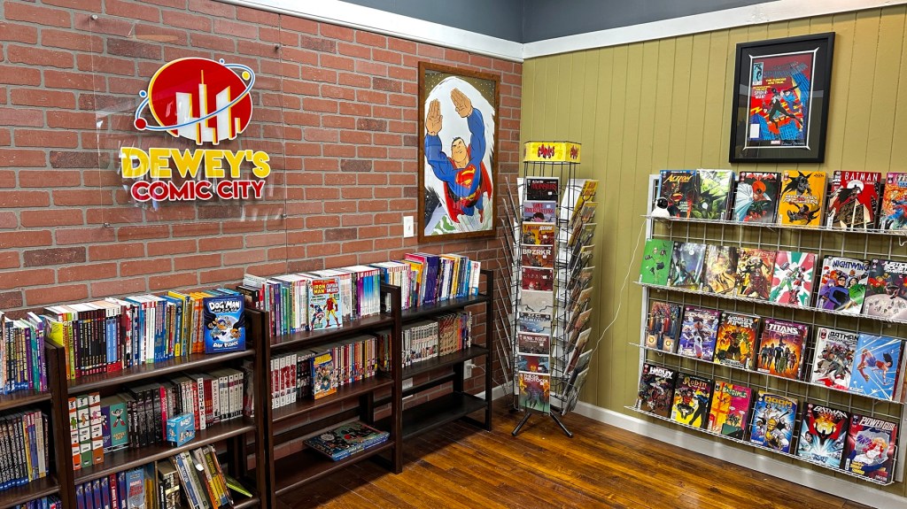 Dewey’s is very cozy with plenty of space for the comics & collectibles for sale, with dedicated sections for recent releases, back issues, kids & manga, and trade paperbacks & hardcovers. On top of all of that, the entire shop is covered wall-to-wall with original art and signed art prints… so comic art lovers should definitely keep their eyes peeled to see what they’ll come across!