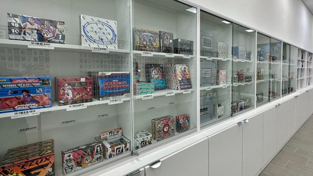 You’ll also come across the ever popular mystery Slab Kings & mystery Hit Kings, Monmouth Cards brand encased raw singles, and an extraordinary wall of graded cards (above) featuring over a thousand slabs categorized by football, baseball, basketball, miscellaneous sports, and Pokemon. There’s even a section for “Jewels” such as graded autographs, relic patches, numbered hits like 1/1’s, and a highly sought after 1986 Fleer Michael Jordan for nearly $5,000!