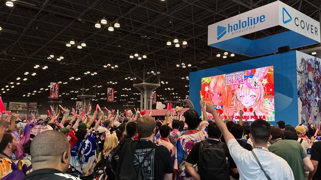 Anime NYC’s three floors allow you to enjoy a wide variety of experiences, including shopping for memorabilia at Artist Alley & vendor booths, video & tabletop gaming, cosplay meetups, VTuber performances (above), and autographs & photos with special guests like Bryce Papenbrook, Steve Blum, Aleks Le, and Alyson Leigh Rosenfeld… as well as lottery-based free signings with Shoji Kawamori, Toshio Furukawa, Studio Orange, and other guests of honor.