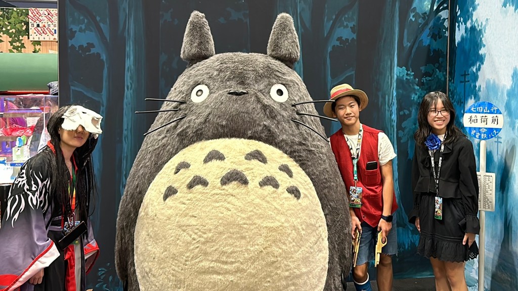 Buying Japanese collectibles couldn’t be any easier! All of the top merchandise can be found under one roof at Anime NYC: statues & figures, model kits, blind boxes, plushies, trading cards, acrylics, Blu-ray & DVDs, apparel, prop replicas, games, posters & original art, and much more from nearly 1,000 exhibitors & artists to shop from. Not to mention fan-favorite brands like V1 Tech, Bandai, Viz Media, Aniplex, Kinokuniya, Bushiroad, HYPLAND, and Anime NYC title sponsor Crunchyroll. Many offered first come, first served giveaways and fun backdrops such as Studio Ghibli’s Totoro photo op (below):