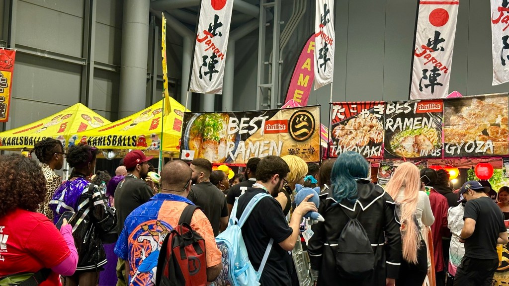 Throughout the weekend, fans can also take advantage of many free offerings & activities. We’re talking about panels & programming, advance movie screenings (City Hunter: Angel Dust & Transformers One) & anime premieres (DAN DA DAN & Terminator Zero), live demonstrations, and even food & drink samples from Otafuku & G FUEL. But one of the highlights every year at Anime NYC is definitely the Japanese Food Hall. This year’s selection had all kinds of Asian treats & sweets like Banh Mi, Takoyaki, Bento Boxes, Tanghulu, Ramen, Bao Buns, Bubble Waffles, Boba Tea, and Dumplings. There’s no reason to be hungry while exploring the con!