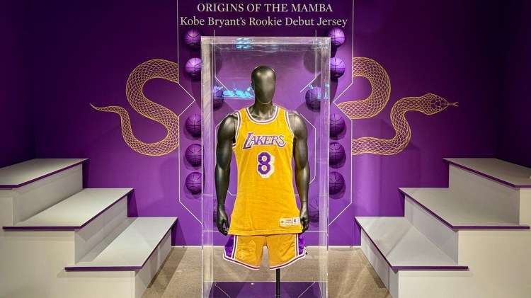 In addition to the exhibition’s “Dawn of an Era” for Michael Jordan are the sections: “Origins of the Mamba” (above) for Kobe Bryant’s rookie debut jersey (above), “NBA Auctions” for various basketball items, “Timeless Titans” for 6 graded legendary sports cards, “Court Classics” (below) featuring 33 pairs of classic sneakers, and “Important Sports Memorabilia” for everything else… like a 1982 Wayne Gretzky signed hockey stick, Tom Brady & Patrick Mahomes game-used footballs, and 2018 Roger Federer signed tennis gear!