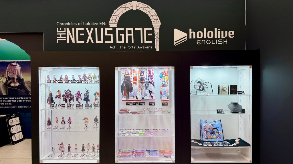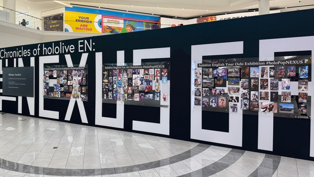 The first official hololive English pop-up store came to American Dream Mall in East Rutherford, NJ from October 6 through November 2, 2025. Located in the mall’s Court C on Level 1, “Chronicles of hololive EN: THE NEXUS GATE -ActⅠ: The Portal Awakens-” featured a walk-through experience complete with story displays, cardboard cutouts of the oshi, meet & greet opportunities, a mystery solving event, merchandise sales, and a fan art exhibition (below).