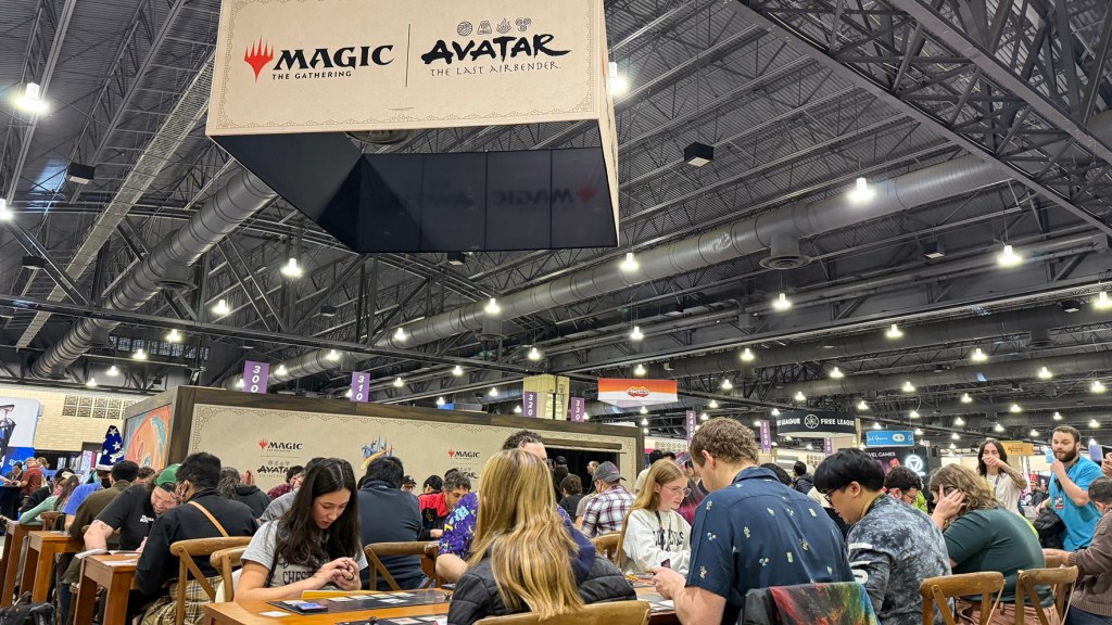 In addition to a plethora of tutorials, tournaments, and freeplay in the Gaming Hall, which stays open later than the rest of the convention, hundreds of games could be demoed in the Expo Hall this year. Indie developers, crowdfundable games, and a vast array of collectibles were all in great company with notable industry presences such as Asmodee, Catan, Kess (offering an exclusive first look at their Tamagotchi and One Piece: Dawn of Liberation games), Warhammer, Doomlings (featuring their Wheel of Doom to win a tri-color convention exclusive promo card), Ultra Pro, One Piece Card Game, UniVersus CCG (who recently collaborated with Riot Games to produce Riftbound, the League of Legends TCG), and Magic: The Gathering, which was celebrating the release weekend of its latest set, “Avatar: The Last Airbender” (below).