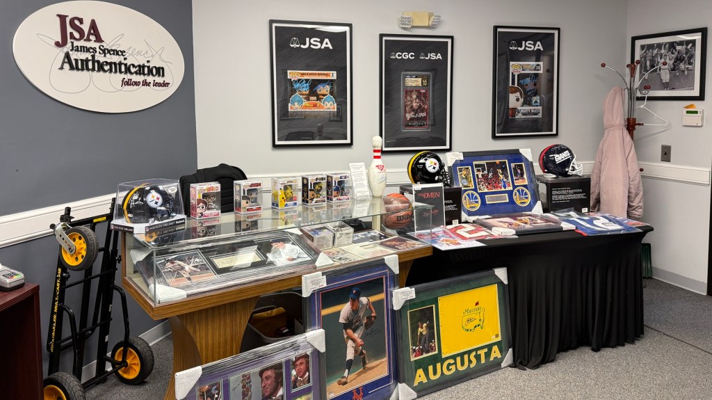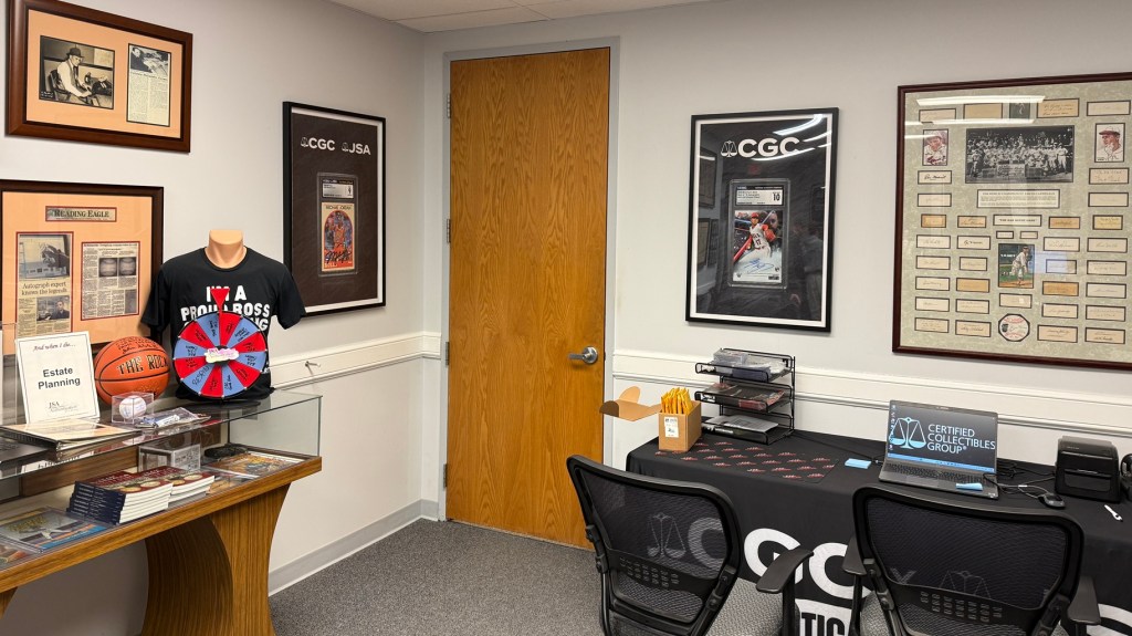 CGC & JSA were accepting submissions for trading card games (TCGs), sports cards, non-sports cards, and collectible coins. This meant that pack-pulled autograph cards could get graded, while on-card signatures could be verified with “JSA Autograph Authentication” for an additional fee. Collectors also used this opportunity to submit (or pick up) bulky item orders: sports collectibles, framed pieces, and other non-encapsulated memorabilia. And while you wait for your turn, go ahead and check out the impressive pieces on display all around the office, ranging from modern autographs to certified pieces of history: